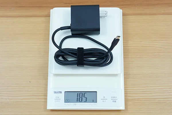 ACアダプターの質量も185gと軽く、小型なので持ち運びしやすいです。本体と合わせても1kgを切ります。