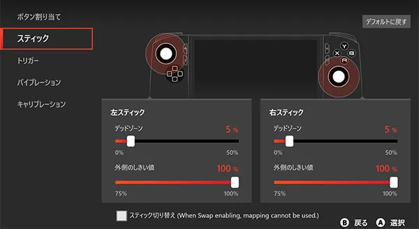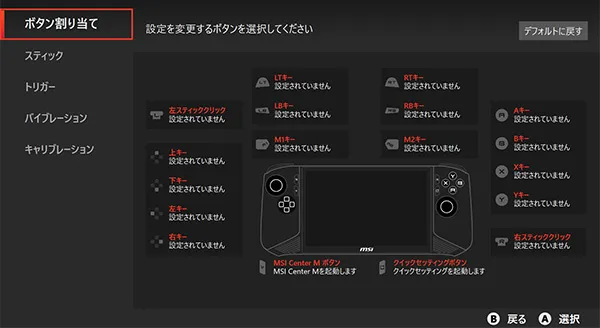 また、「MSI Center M」からは、コントローラーの各種設定が可能で、ボタンの割り当てからスティックとトリガーの感度調整、RGBライティングなどの設定が可能です。