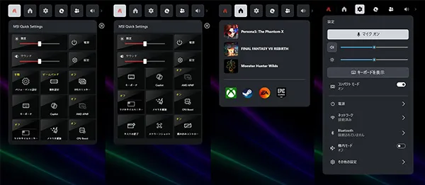 ゲーム中シームレスに呼び出せる「MSI Quick Settings」からは、輝度調整やパフォーマンス設定、FPS制限やキーボードの呼び出し、タスクの終了やシャットダウン、はたまたゲームの起動に至るまで、直感的な操作で行うことができます。