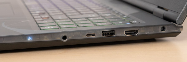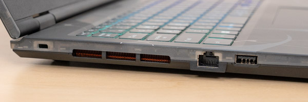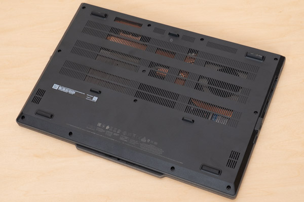 ポート類はご覧の通りです。排気口が右側面にないので、マウスを使う手が熱くなりません。ただ、右側面にポートが集中しているので、このポートにケーブルなどを挿すと、マウス操作の邪魔になりやすいです。