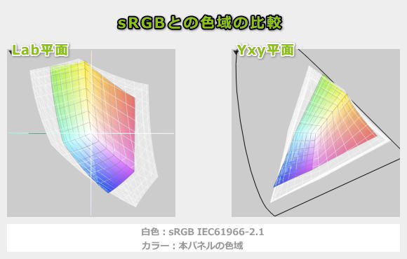 当サイトの測定結果で、sRGBカバー率は66%でした。色域は狭いです。最大輝度は、当サイトの計測では255nitでした。