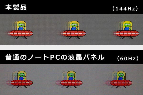 「UFO Test」のサイトの左から右へ移動するUFOを十分速い1/2000のシャッタースピードで撮影し、普通のノートPCと比較しました。普通のノートPCは、60Hzで2フレーム前くらいまでの残像ですが、本製品は、144Hzの高リフレッシュレートで、2~3フレームの残像がありました。残像はやや少なめです。