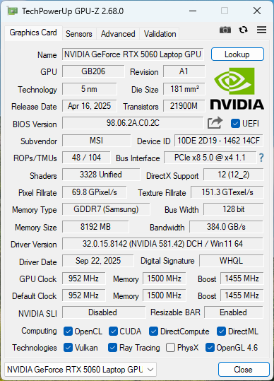 グラフィックスは、GeForce RTX 5060 Laptopを搭載しています。最大グラフィックスパワーは55Wと低めでした。