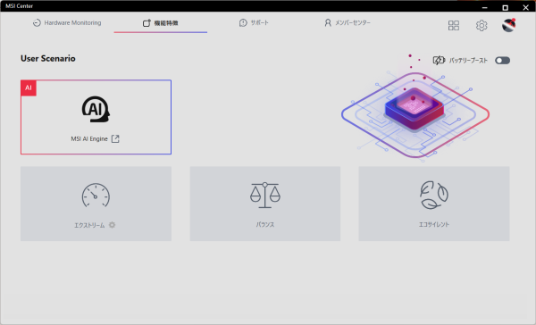 本製品は、MSI CenterのUser Scenarioから、動作モードを変更することができます。今回は「MSI AI Engine」でベンチマークソフトを実行した結果を掲載します。なお、「エクストリーム」にしてもスコアはほぼ変わりませんでした。