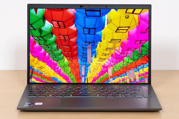 ディスプレイは、13.3型、2880x1800ドット、有機EL、100% DCI-P3です。色域が広くて表示が色鮮やかで、画像や映像が綺麗です。ただ、光沢なので、照明や周囲のものが映り込みやすいです。