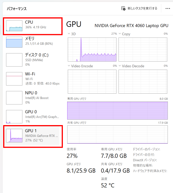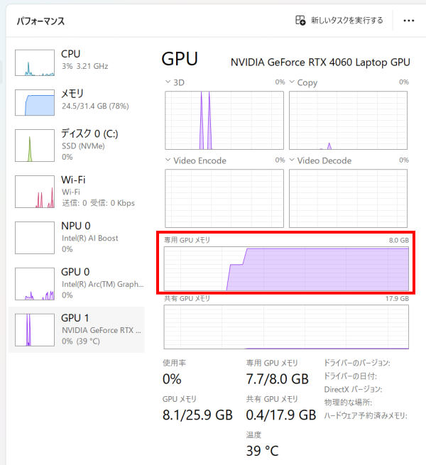 今回、GeForce RTX 4060 Laptopのモデルを搭載していますが、VRAMは8GBです。この8GBに収まる分だけ、独立GPUのVRAMに、レイヤーのパラメータがオフロードされていました。