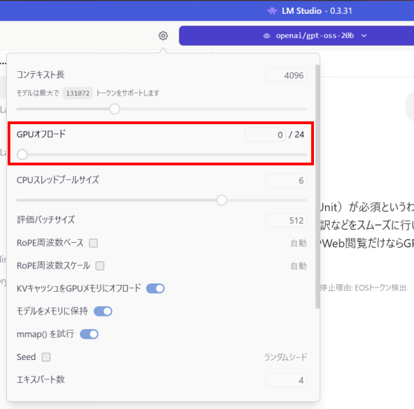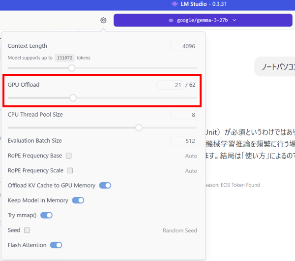 GPU Offloadの設定を見ても、「62」のうち「21」のパラメータが、独立GPUにロードされているのが分かります。なお、ここは自分で設定を変更することが可能です。