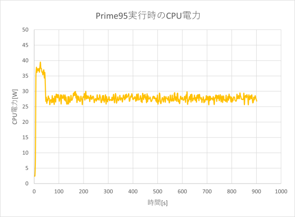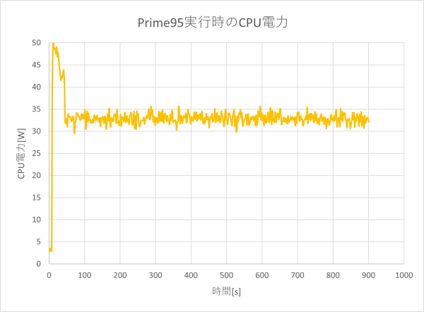 Prime95で、全てのCPU使用率が100%になる負荷をかけたときのCPU電力の推移
