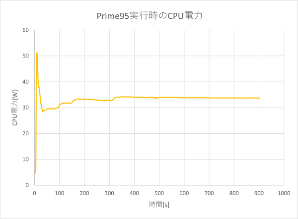 Prime95で、全てのCPU使用率が100%になる負荷をかけたときのCPU電力の推移