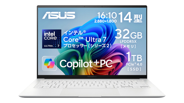 今回、個人的に注目なのが、Core Ultra 7 258Vを搭載し、約1.2kgと軽く、バッテリー駆動時間もかなり長いASUS Zenbook S 14です。60,000円引きで、199,800円で販売されています。