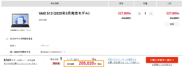 VAIOのフラグシップ機であるVAIO SX14-Rシリーズが「25万円台~」であるのに対して、VAIO S13は「16万円台~」と価格も抑えられており、あこがれのVAIOが少し入手しやすくなっているもの嬉しいです。記事執筆時点では、10%OFFキャンペーンも実施しており、さらに安く購入することができます。